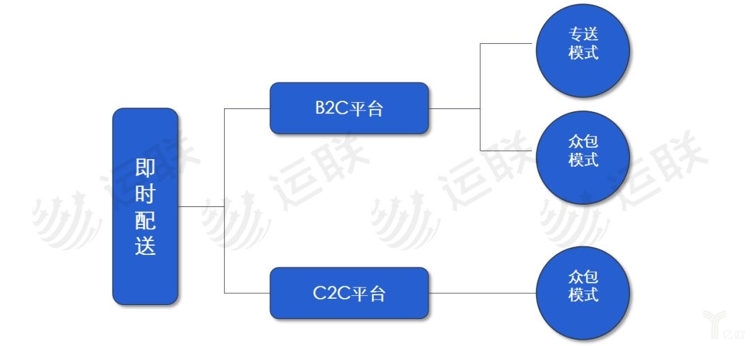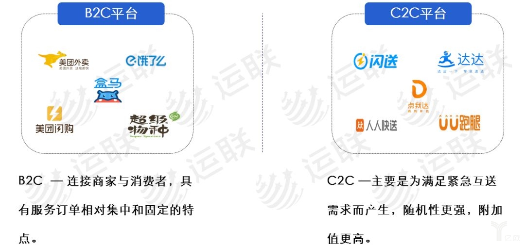 即时配送行业最终面对的客户都是C端消费者,从经营模式上看,即时配送行业的企业整体可归为B2C、C2C两大类。从各自的运营模式来看,B2C中又包含专送模式和众包模式两种,而C2C只有众包模式。从资产模式的角度看,即时配送行业的企业,都是以轻资产模式切入,通过平台形式进行运作,通过数据系统建立庞大的运力群体,支撑其庞大的C端客户需求。在运力组成模式上,当前多数企业都采用了的运力众包模式,通过APP端吸纳社会闲散运力,构成平台的运力池。